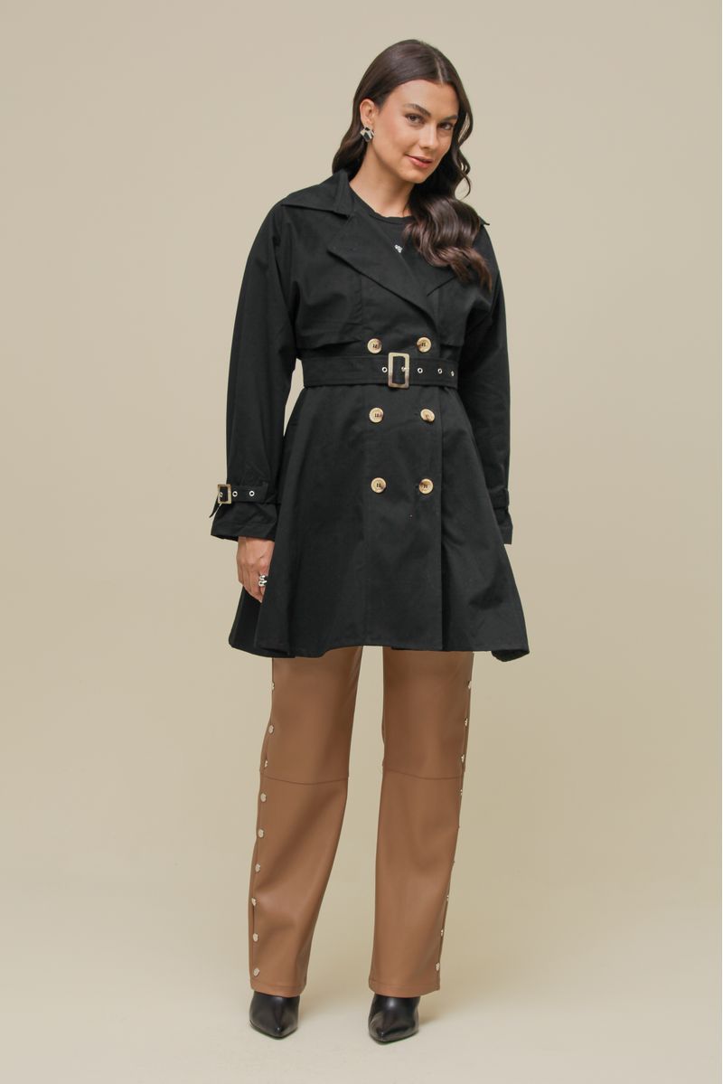 Casaco trench coat confeccionado em tecido sarjado, com modelagem ampla e caimento estruturado. Possui parte superior sobreposta fixa e recortes abaixo das axilas para melhor ajuste. O forro acetinado está presente apenas no tronco, proporcionando conforto. A parte inferior franzida adiciona um efeito sutil de saia, trazendo sofisticação ao design. Conta com fechamento transpassado por botões, bolsos frontais funcionais e mangas longas com ajuste nos punhos. Acompanha faixa com fivela para ajuste na cintura.