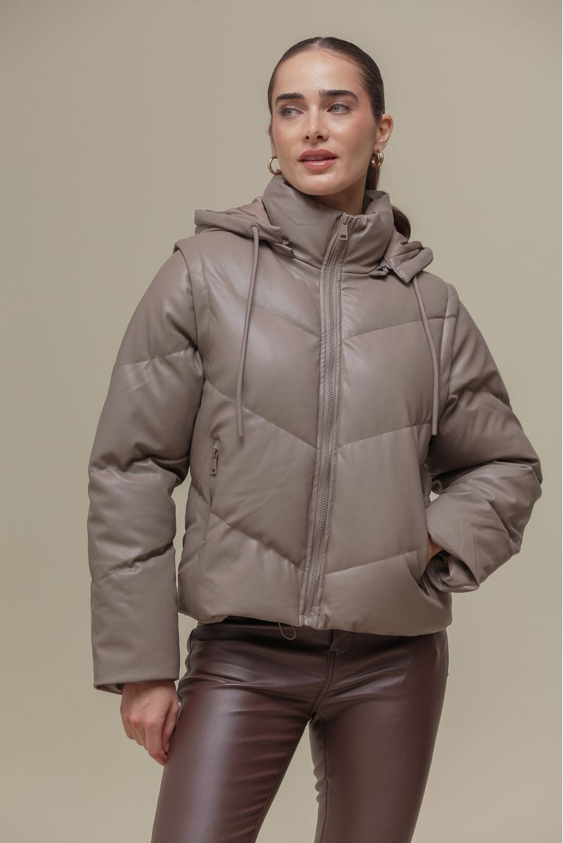 Jaqueta puffer confeccionada em PU, garantindo visual moderno e sofisticado. Possui modelagem ampla e estruturada, com enchimento que proporciona aconchego e proteção térmica. O diferencial da peça está nas mangas e capuz removíveis por zíper, permitindo diferentes formas de uso, como jaqueta ou colete. Conta com fechamento frontal por zíper, bolsos com fechamento prático e capuz ajustável com cordão. Ideal para dias frios, unindo estilo e funcionalidade.