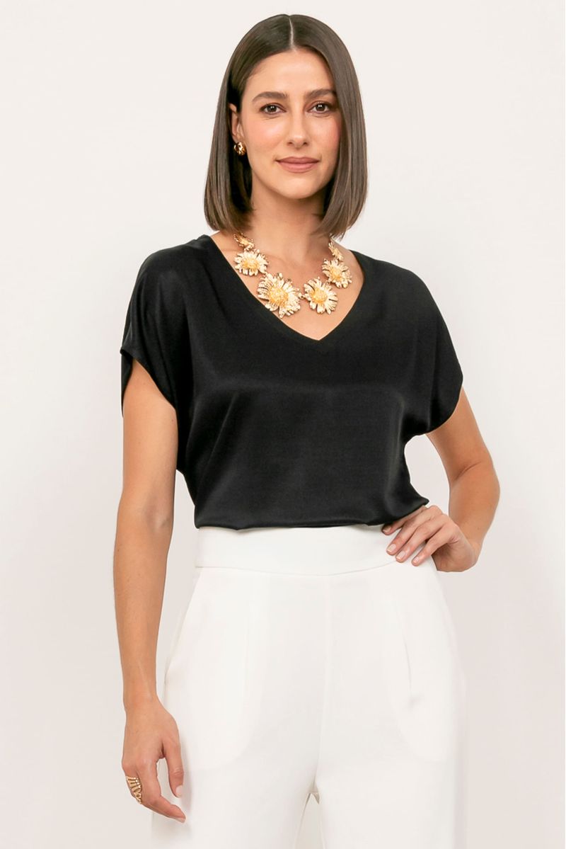 Blusa modelagem ampla, confeccionada em viscose, toque acetinado. Decote V e manga curta, acompanha colar de flor dourada.