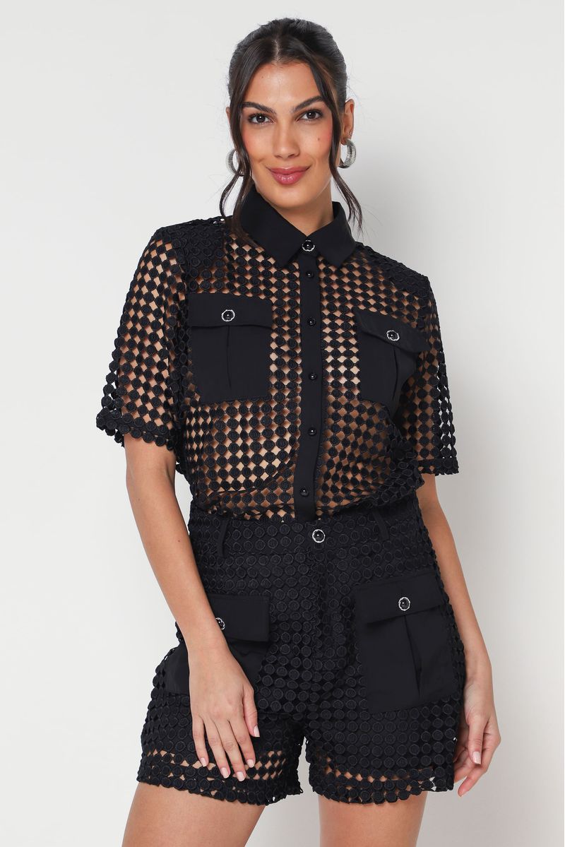 Camisa guipure em poá, não possui forro interno. Bolsos frontais com lapela e gola tradicional, confeccionado em crepe, botão com pérola e strass nos bolsos e gola. Abotoamento frontal com botões em pérolas, com ombreiras, possui manga curta e corte reto.