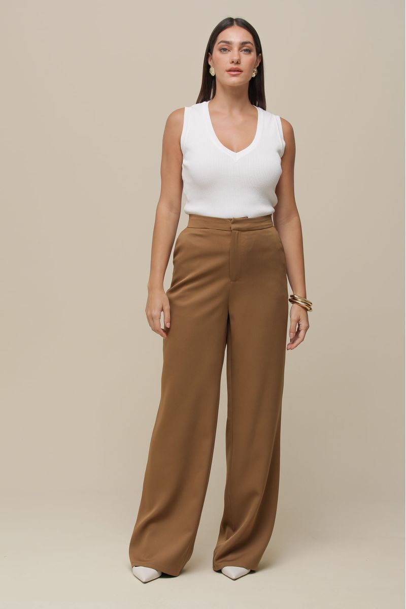 Calça de alfaiataria em crepe acetinado, com modelagem reta que confere elegância e sofisticação. Possui forro interno, bolsos faca discretos e cintura alta, proporcionando um caimento impecável. O fechamento é feito por zíper e gancho invisível, mantendo a peça clean e refinada.