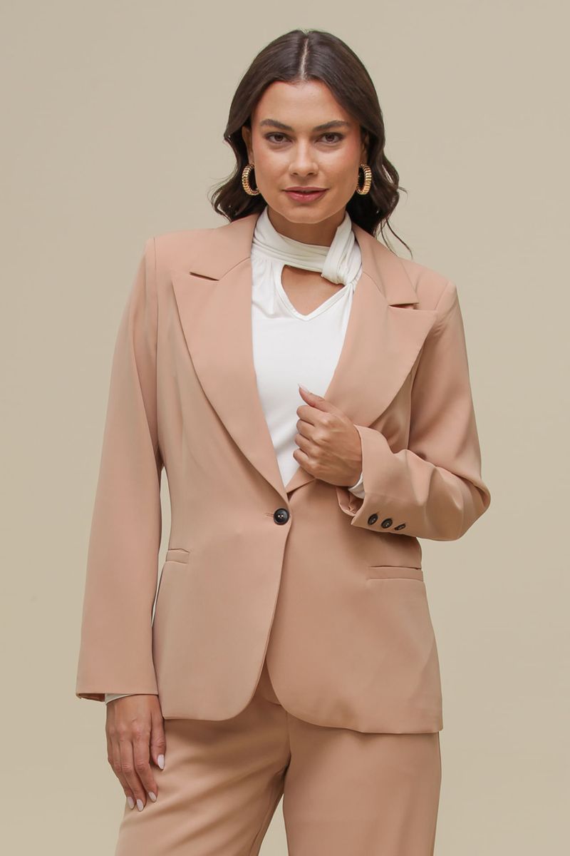 Blazer alongado em crepe de alfaiataria, com forro interno e modelagem acinturada. Possui ombreiras para uma estrutura elegante, fechamento frontal por um botão e botões nos punhos como acabamento.