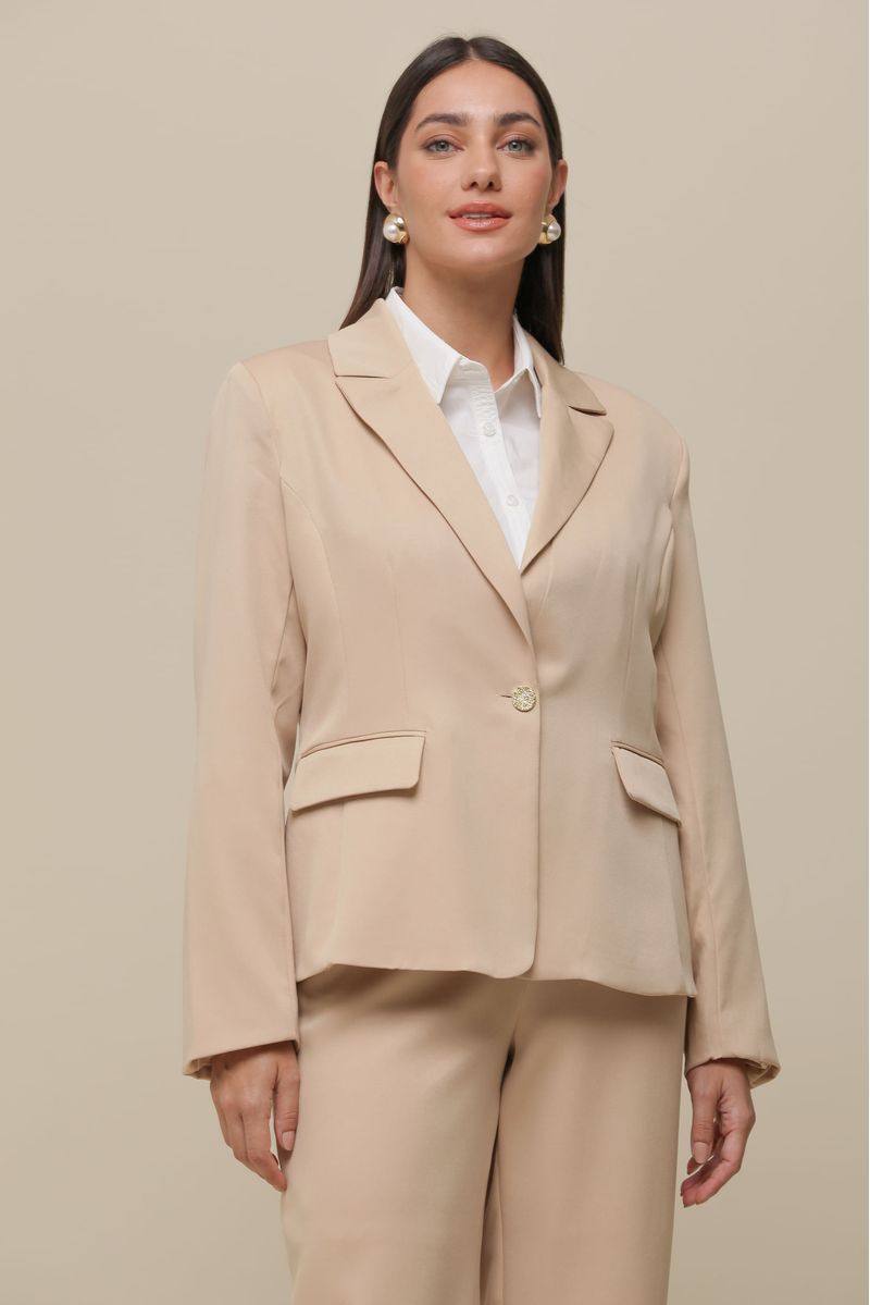 Blazer de alfaiataria confeccionado em crepe acetinado, com um toque de sofisticação. Apresenta forro interno, bolsos frontais com lapela e um botão frontal ornamentado que destaca o estilo clássico. A modelagem ampla, com ombreiras e gola tradicional, traz um ar de elegância ao look.