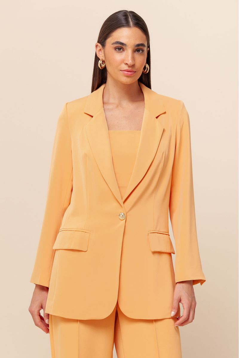 Blazer alongado de alfaiataria em crepe, com forro acetinado, ombreiras que proporcionam uma estrutura elegante, botão frontal dourado, e bolsos frontais com lapela para um toque clássico.