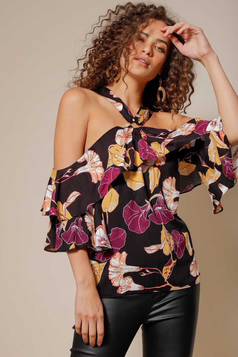 Blusa de viscose com estampa floral exclusiva Mamô, manga curta. Modelo com shape ombro a ombro vazado, com babados e detalhe argola de metal.
