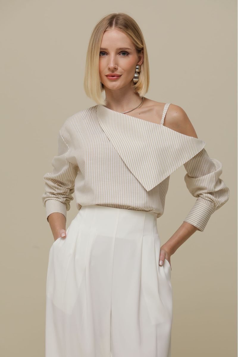 Blusa ampla em tricoline leve, com estampa listrada, que traz um visual moderno e sofisticado. A manga longa do lado direito tem o design clássico, enquanto a manga esquerda é assimétrica, com o ombro de fora e alça fina ajustável com botões. A gola sobreposta traz um detalhe extra de estilo, tornando esta peça única e cheia de personalidade.