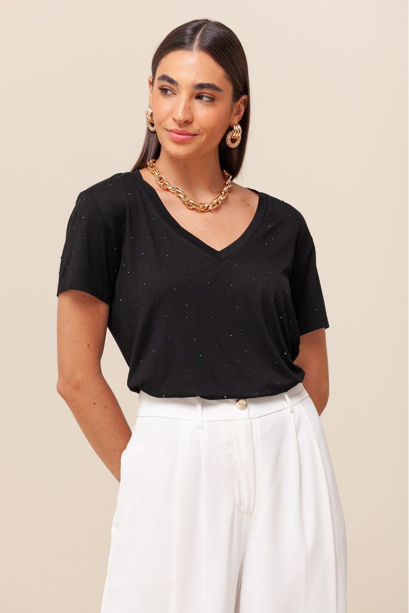 Camisa em malha com decote em V, adornada com aplicação de strass que traz um brilho sofisticado à peça. A manga curta proporciona conforto, tornando esta blusa perfeita para eventos casuais e mais formais.