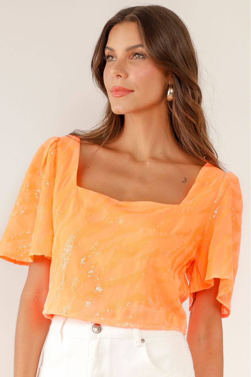Blusa cropped, confeccionada em chiffon, manga fluída, lastex nas costas, detalhes em paetê transparente, decote quadrado, fechamento por zíper invisível.