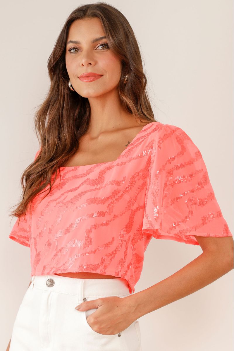 Blusa cropped, confeccionada em chiffon, manga fluída, lastex nas costas, detalhes em paetê transparente, decote quadrado, fechamento por zíper invisível.