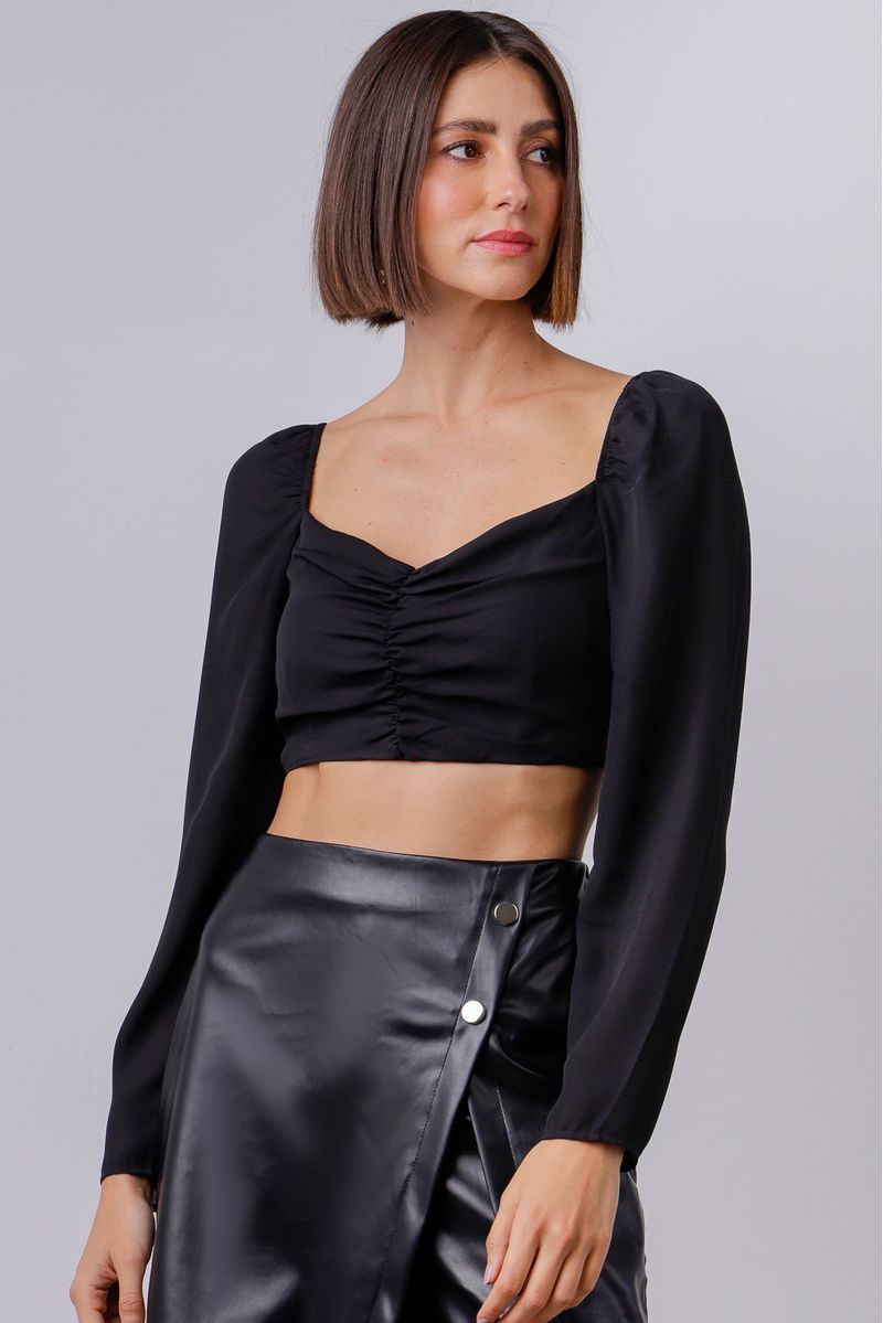 Blusa cropped confeccionado em crepe com manga comprida. Possui elástico nas costas e ombros, decote v franzido.