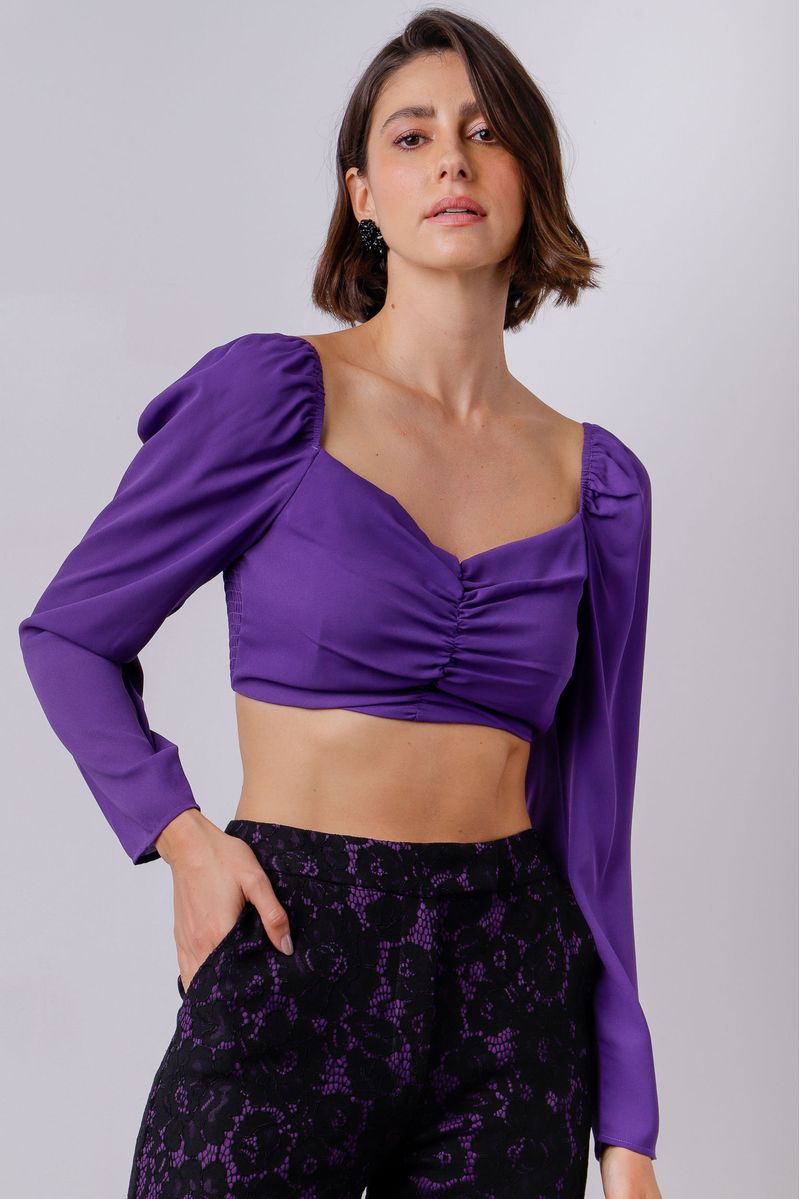 Blusa cropped confeccionado em crepe com manga comprida. Possui elástico nas costas e ombros, decote v franzido.
