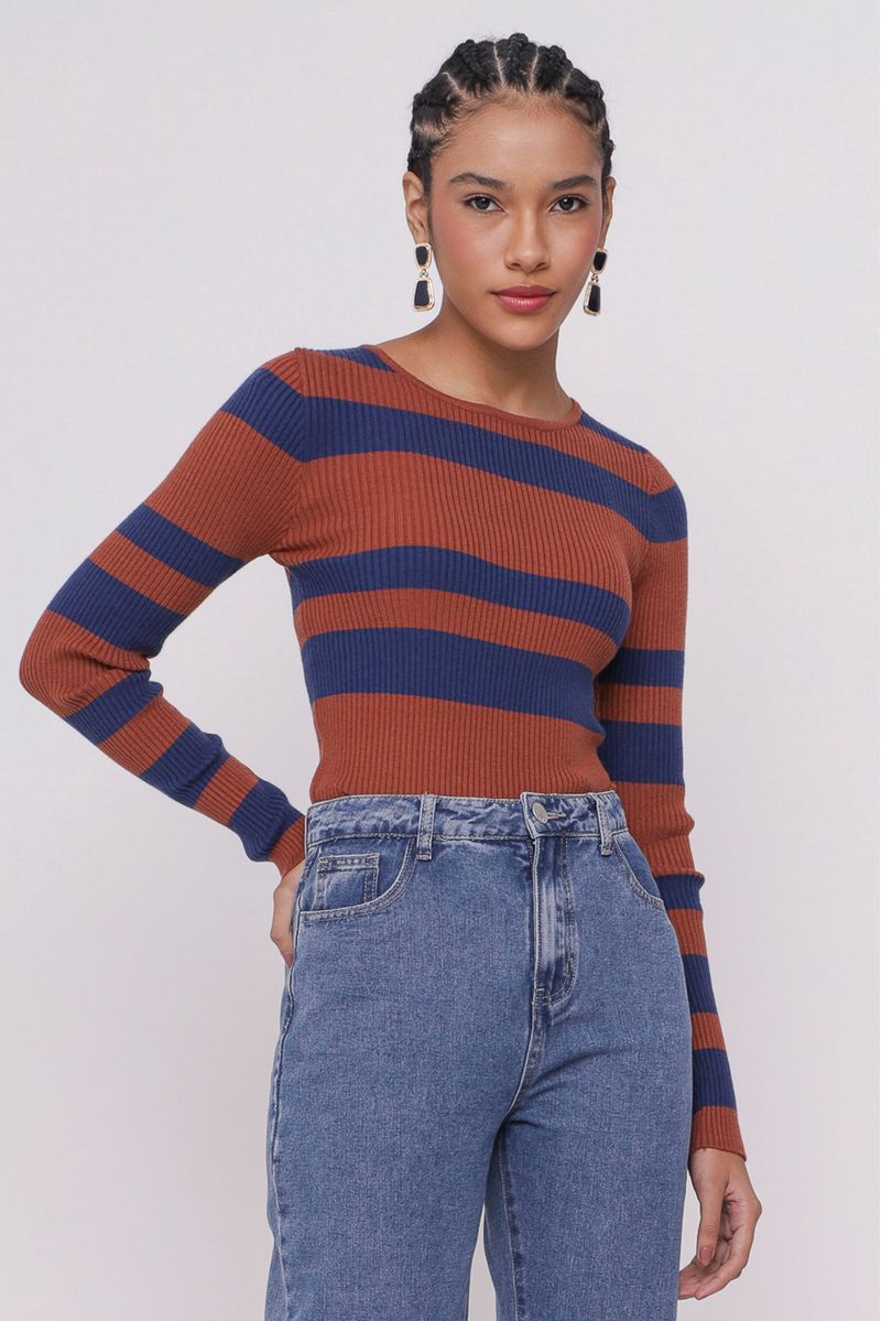 Blusa confeccionada em tricô, com mangas longas e estampa com listras na horizontal. Possui gola careca, proporcionando um visual moderno e confortável para o dia a dia.
