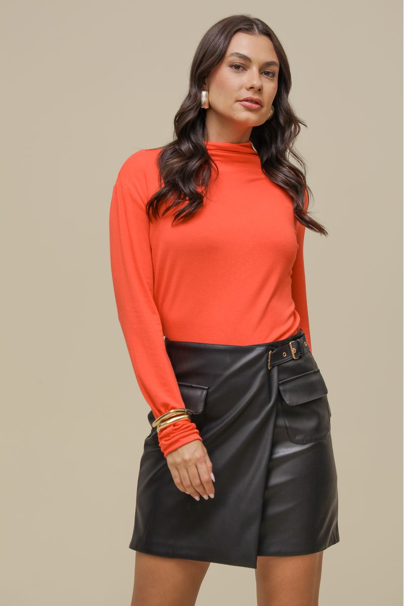Blusa de modelagem ampla, confeccionada em malha com elastano para conforto e flexibilidade. Possui gola alta franzida e punhos franzidos, que adicionam um toque sofisticado. O tecido leve e macio garante caimento impecável e sensação agradável ao vestir.