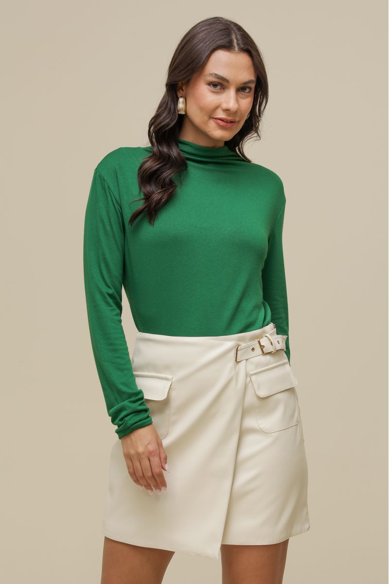 Blusa de modelagem ampla, confeccionada em malha com elastano para conforto e flexibilidade. Possui gola alta franzida e punhos franzidos, que adicionam um toque sofisticado. O tecido leve e macio garante caimento impecável e sensação agradável ao vestir.