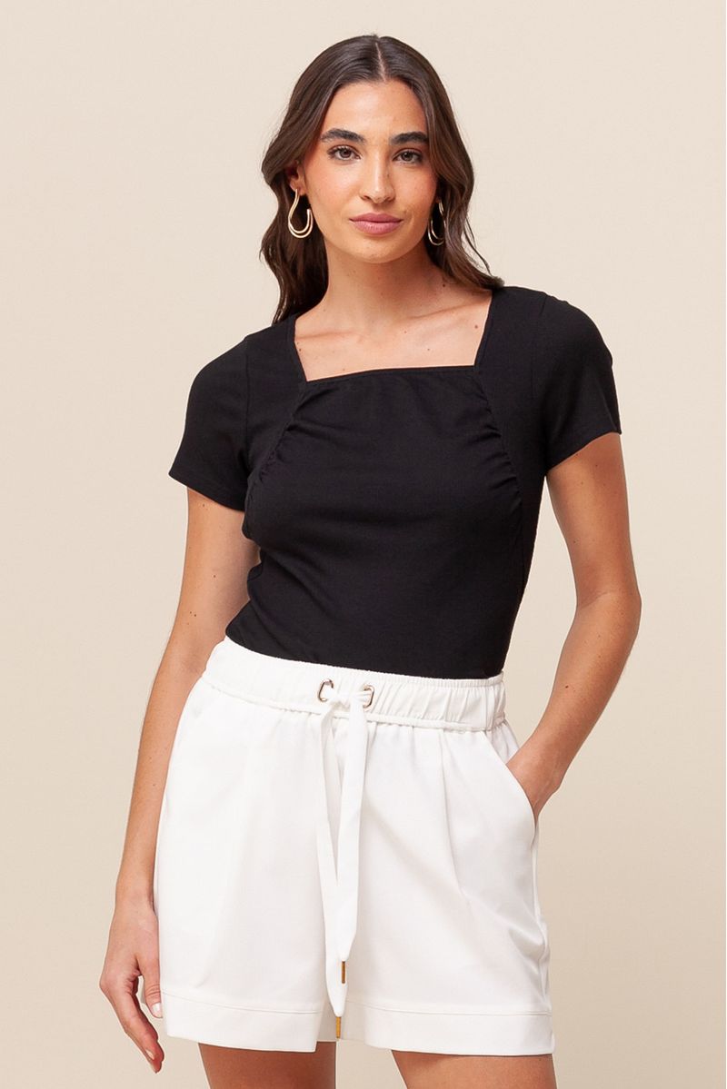 Blusa em malha canelada, com mangas curtas e decote quadrado. O franzido nas laterais adiciona um toque de charme e valoriza a silhueta de forma delicada e sofisticada.