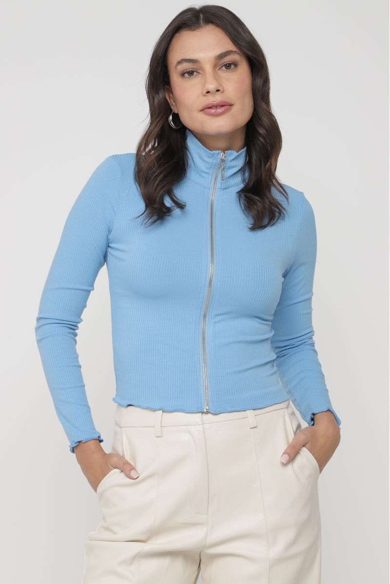 Blusa de manga longa em malha canelada, com gola alta e zíper frontal. As barras e punhos possuem um delicado acabamento ondulado.