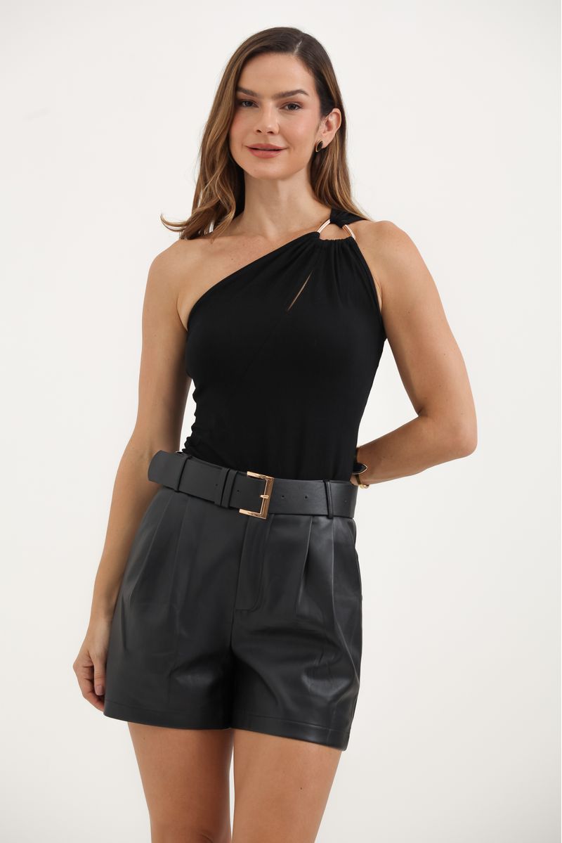 Blusa confeccionada em malha de um ombro só, com recorte frontal e abertura em formato de gota na diagonal, que adicionam sofisticação e personalidade ao visual. O aviamento em metal no ombro cria um detalhe moderno e marcante, enquanto a modelagem valoriza a silhueta. Uma peça versátil e contemporânea, perfeita para composições que combinam estilo urbano com elegância refinada.