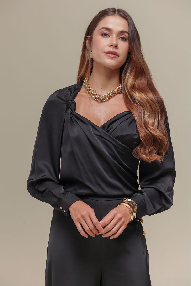 Blusa de manga longa em tecido acetinado com decote transpassado e detalhe de torção no ombro. Modelagem ajustada ao corpo e punhos com botões dourados.