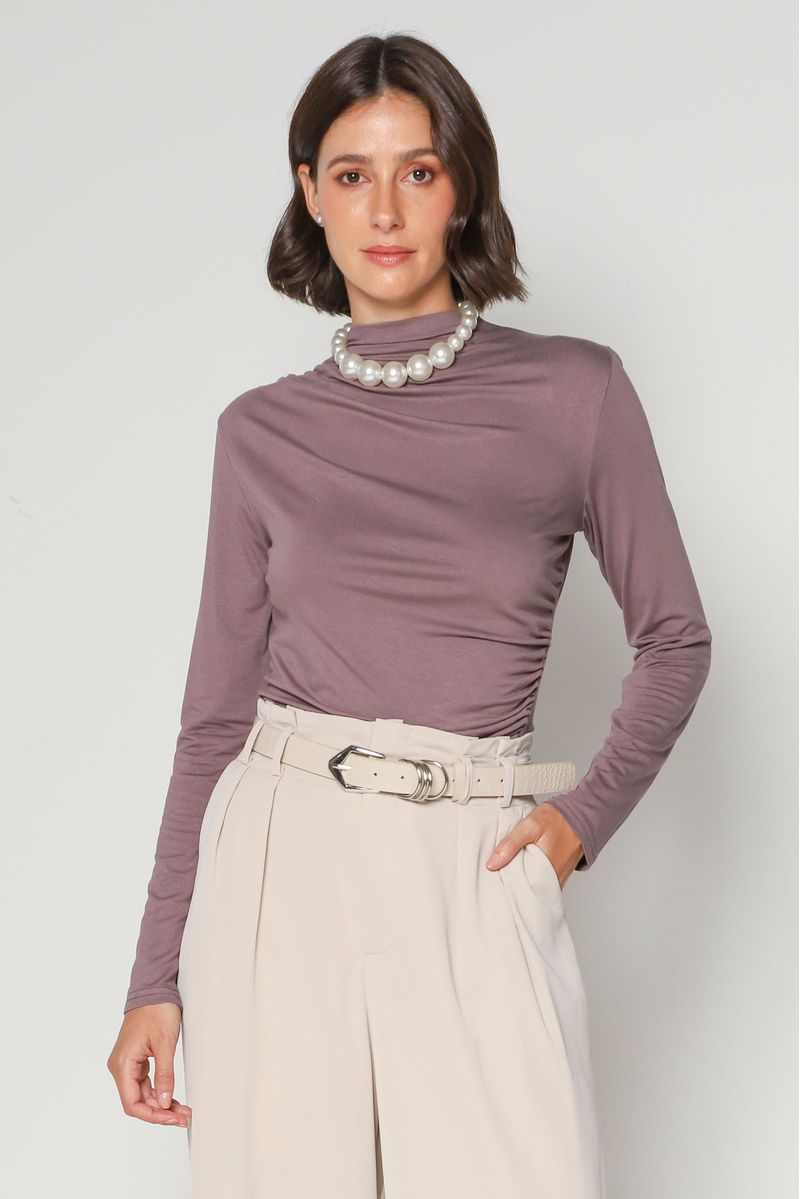 Blusa malha de viscose com elastano, gola alta e manga longa. Possui franzidos nas laterais, tecido fino e levinho.