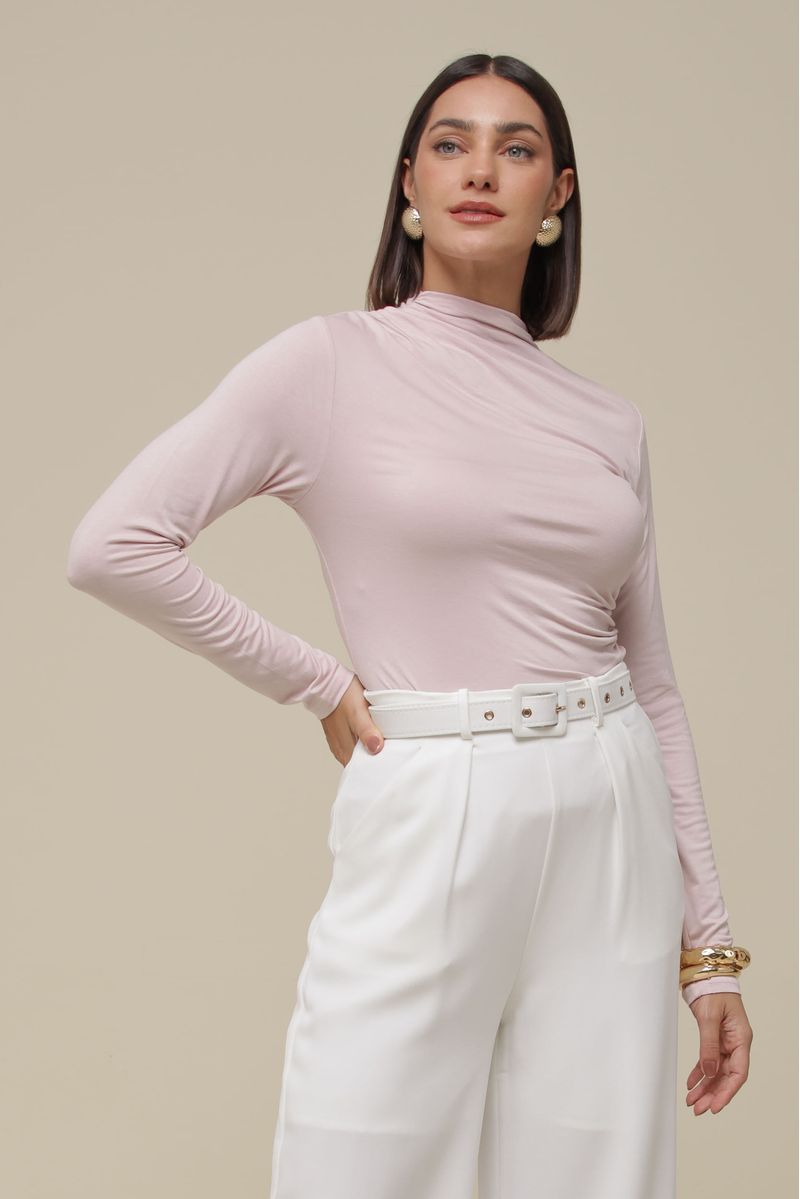Blusa confeccionada em malha com toque macio. O modelo de manga longa apresenta gola alta franzida e detalhe drapeado na lateral esquerda, realçando a silhueta com sofisticação.