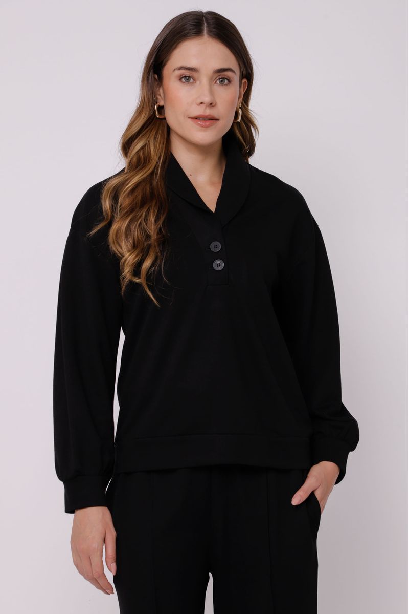 Blusa de moletom comfy. Gola tradicional com botões, adicionando um toque de estilo adicional ao conforto.