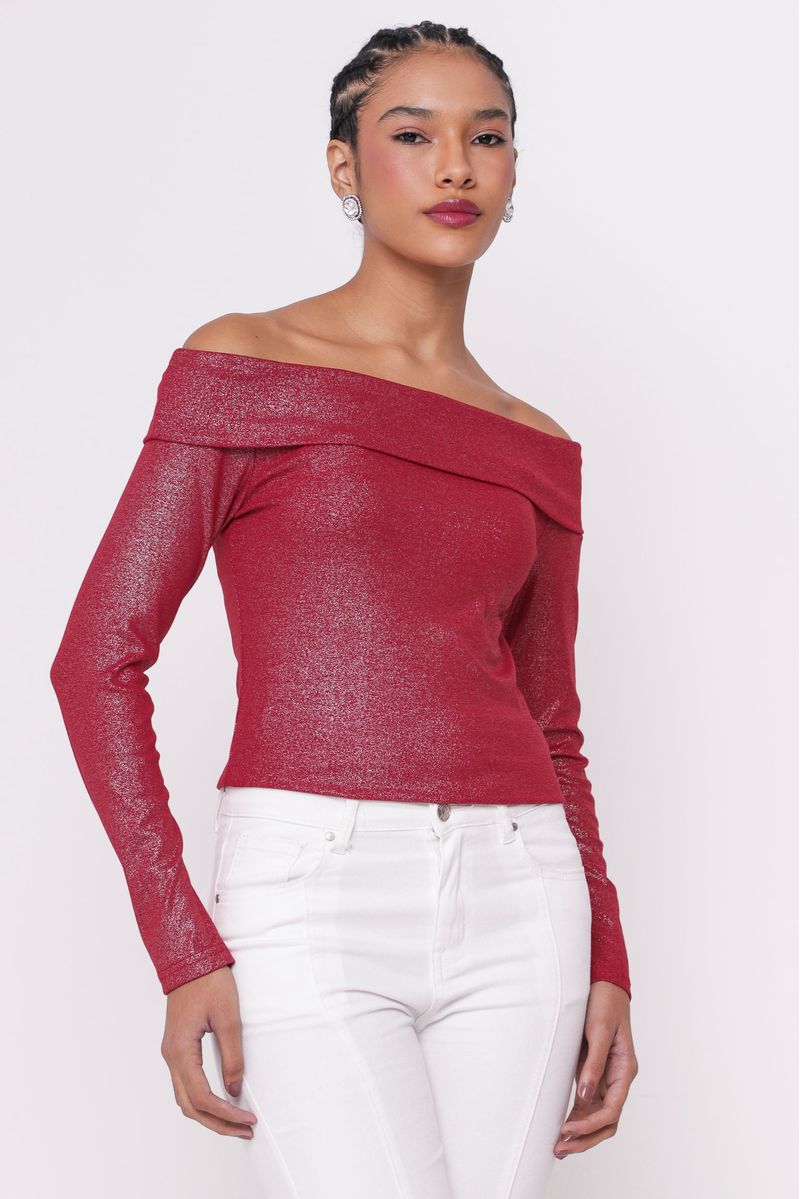 Blusa ombro a ombro confeccionada em malha, proporcionando um tecido suave e flexível. Seu acabamento em foil metalizado confere um brilho encantador à peça, adicionando um toque de glamour ao seu look.