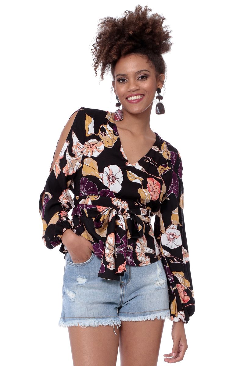 Blusa de viscose com estampa floral exclusiva Mamô, manga longa e decote V. Acompanha cinto faixa feito do mesmo tecido e punhos com elástico.