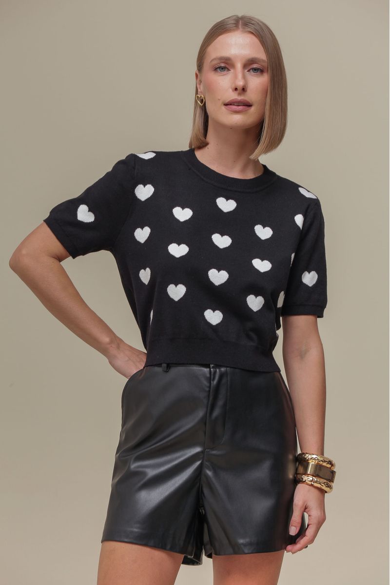 Blusa cropped de tricô com manga curta e estampa delicada de corações, proporcionando um toque romântico e moderno à peça. Ideal para looks casuais e cheios de estilo.