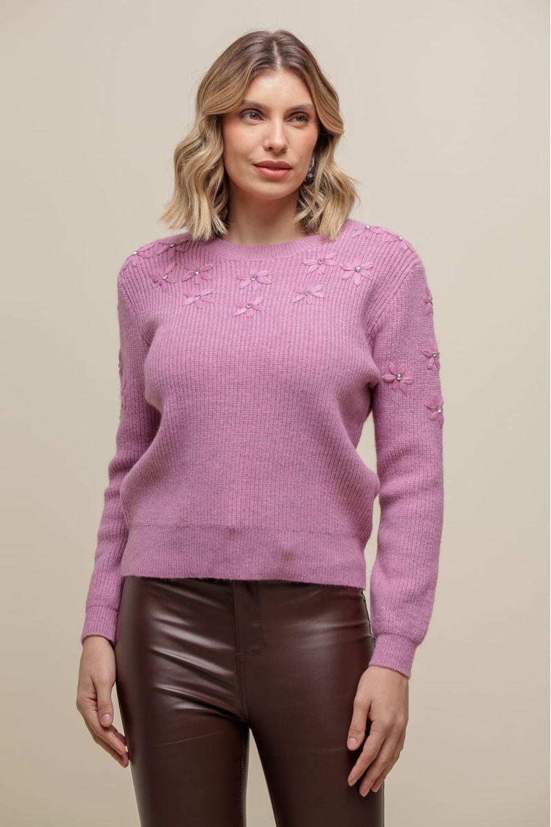 Blusa de tricô bem quentinha, com gola careca e bordado de flores na parte frontal e nos ombros. As flores contam com aplicação de brilho, destacando ainda mais o charme da peça.