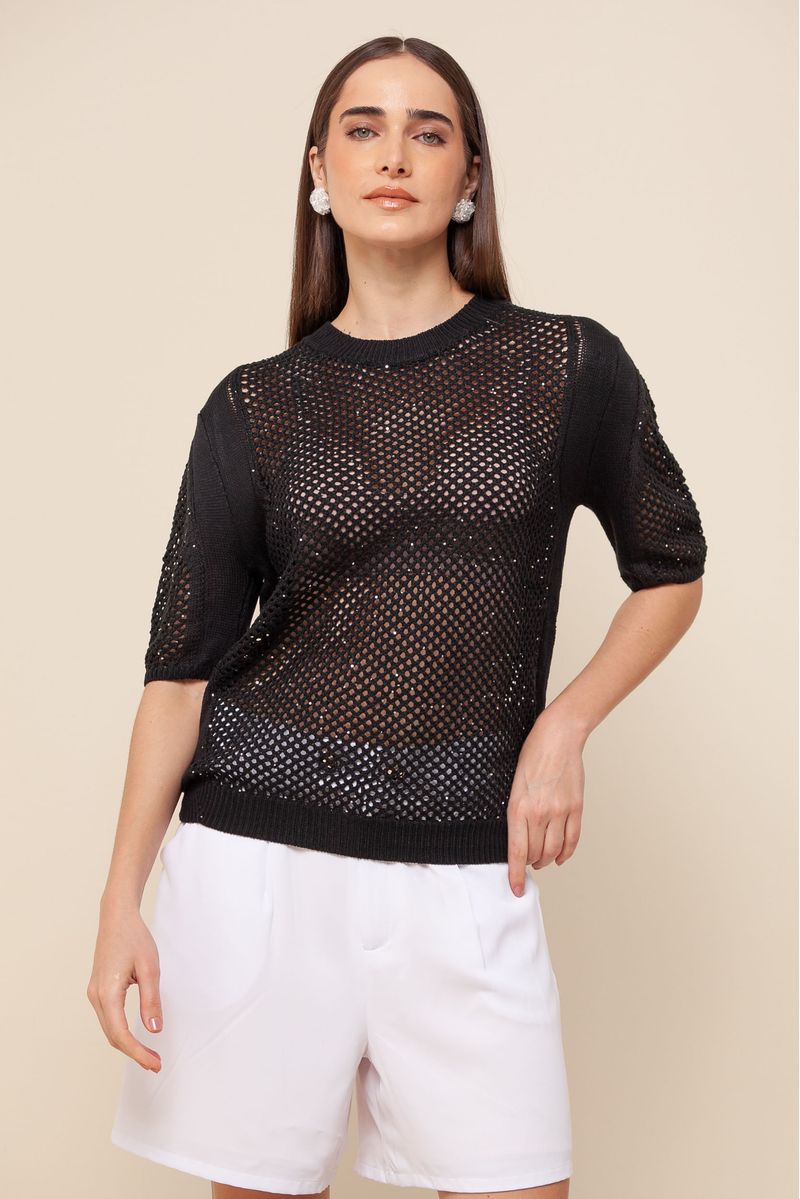 Blusa em tricô com manga 3/4 e gola careca, confeccionada em trama vazada que adiciona leveza e estilo à peça. Os detalhes nos ombros proporcionam um toque especial, tornando-a perfeita para sobreposições ou para ser usada sozinha com um top por baixo.