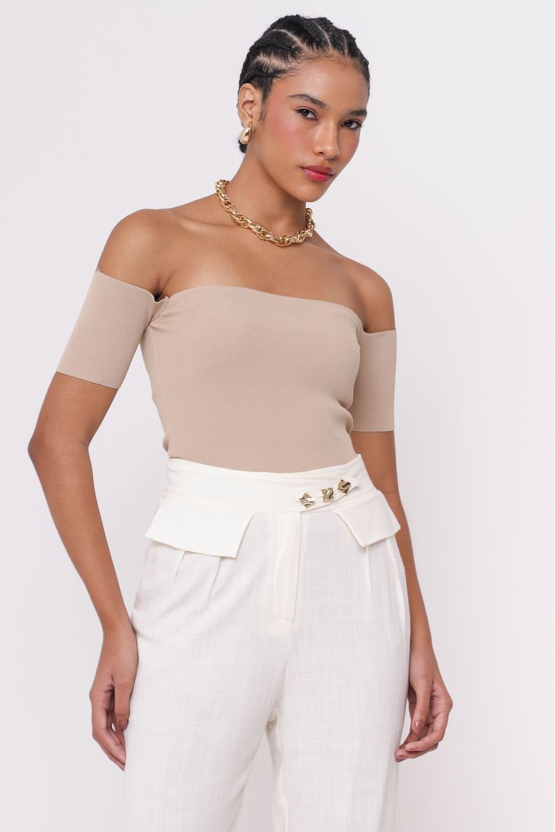 Blusa justa confeccionada em tricô, com modelo ombro a ombro e mangas curtas estilo ciganinha. Perfeita para destacar os ombros e criar um visual charmoso.