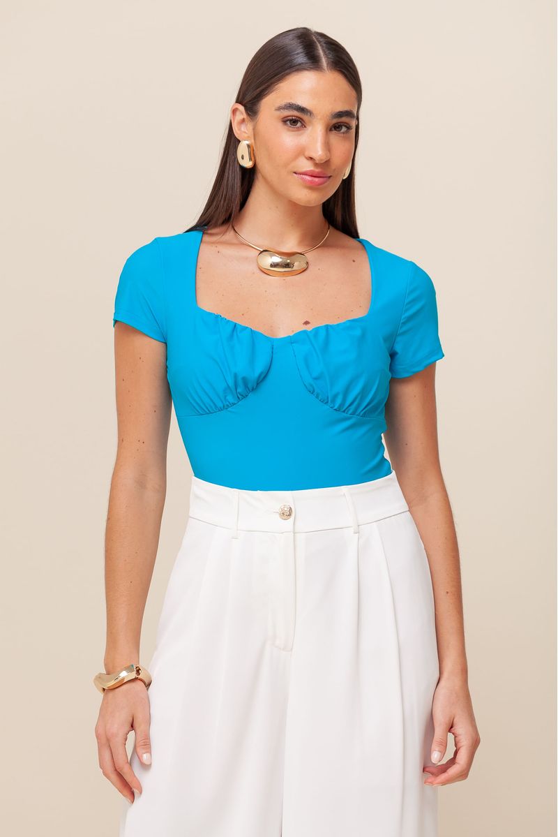 Body em suplex, com mangas curtas e busto franzido que valoriza a silhueta. O decote quadrado traz um toque de sofisticação, enquanto a parte inferior é prática e funcional com pequenos botões de pressão.