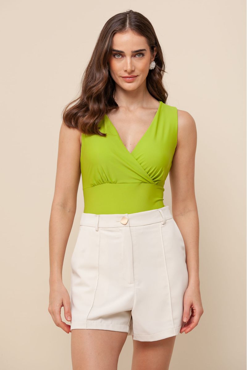 Body em jersey com decote transpassado, ideal para criar looks elegantes e confortáveis. A parte inferior possui fechamento por botão de pressão e um cordão para ajuste na cintura, permitindo um caimento perfeito.