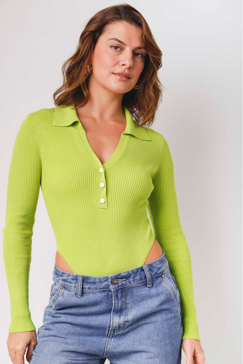 Body cavado com manga longa, confeccionado em tricot. Decote V com botão de pressão dourado. Fechamento inferior por botão de pressão.