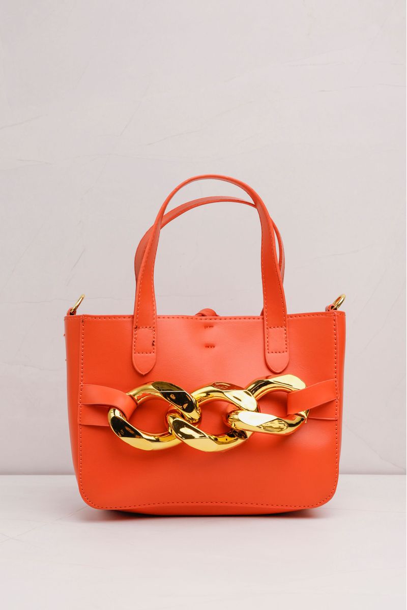 Bolsa confeccionada em PU. Com alças de mão e transversal removível, possui big corrente frontal metalizada. Bolsa interna removível, com forro e bolsinho interno. Fecho superior por cordão de amarração.