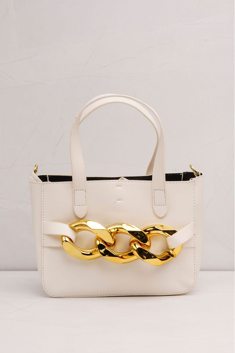Bolsa confeccionada em PU. Com alças de mão e transversal removível, possui big corrente frontal metalizada. Bolsa interna removível, com forro e bolsinho interno. Fecho superior por cordão de amarração.