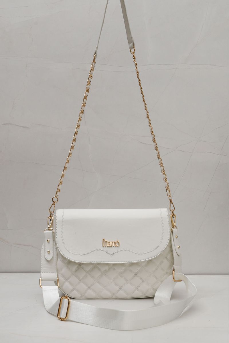 Bolsa matelassê compacta e sofisticada, com tampo liso frontal e fechamento por ímã. Possui duas alças removíveis: uma em nylon ajustável e outra com corrente entrelaçada. Modelo sem forro e sem bolsos internos.