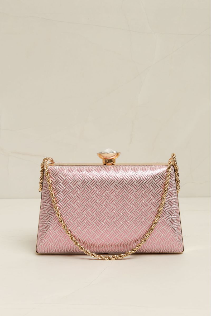 Bolsa clutch texturizada com efeito cintilante, alças de mão em corrente trançada e alça de ombro removível em corrente. O forro interno é acetinado e o fecho superior é adornado com uma pedra, trazendo um toque de elegância à peça.