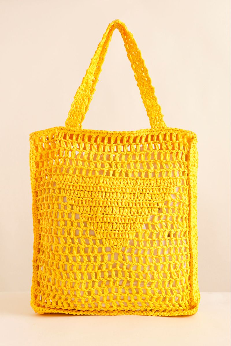 Bolsa confeccionada em crochê com aspecto de palha. A peça possui tamanho grande, formato quadrado, sem forro, fechamento por zíper e alça de ombro fixa.