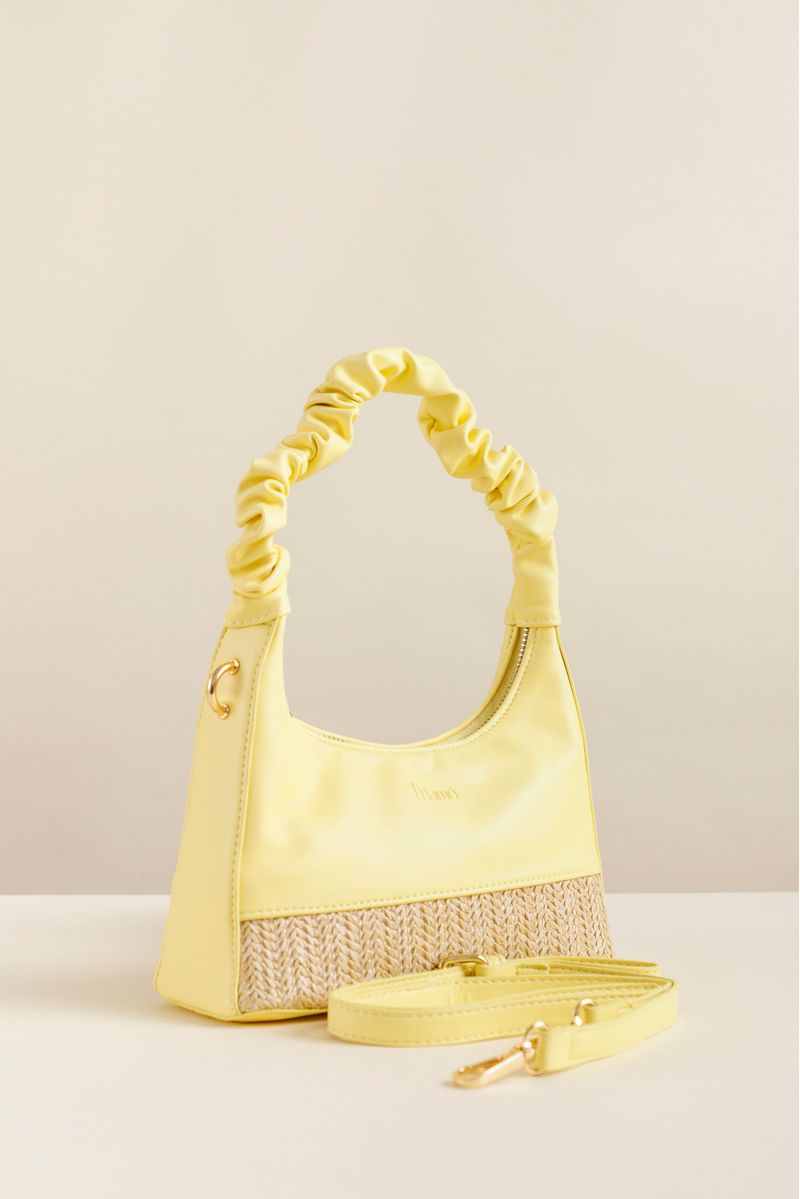 Bolsa mini tote com detalhe em ráfia, apresenta alças reguláveis e uma tira colo plissada, combinando elegância e praticidade em um acessório compacto.