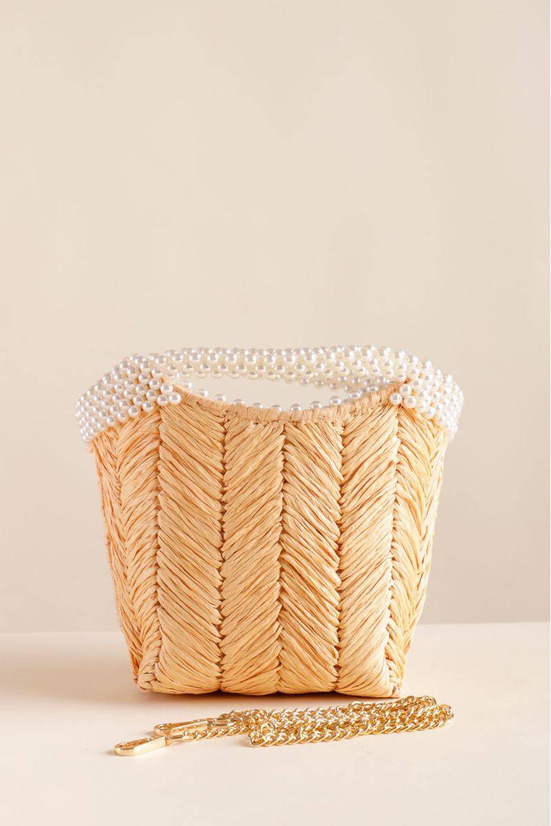 Bolsa estruturada em mix de palhas, formato de cesta com aplicações de pérolas na borda e nas alças de mão. Com forro interno e botão de pressão para fechamento, possui alça em corrente removível.