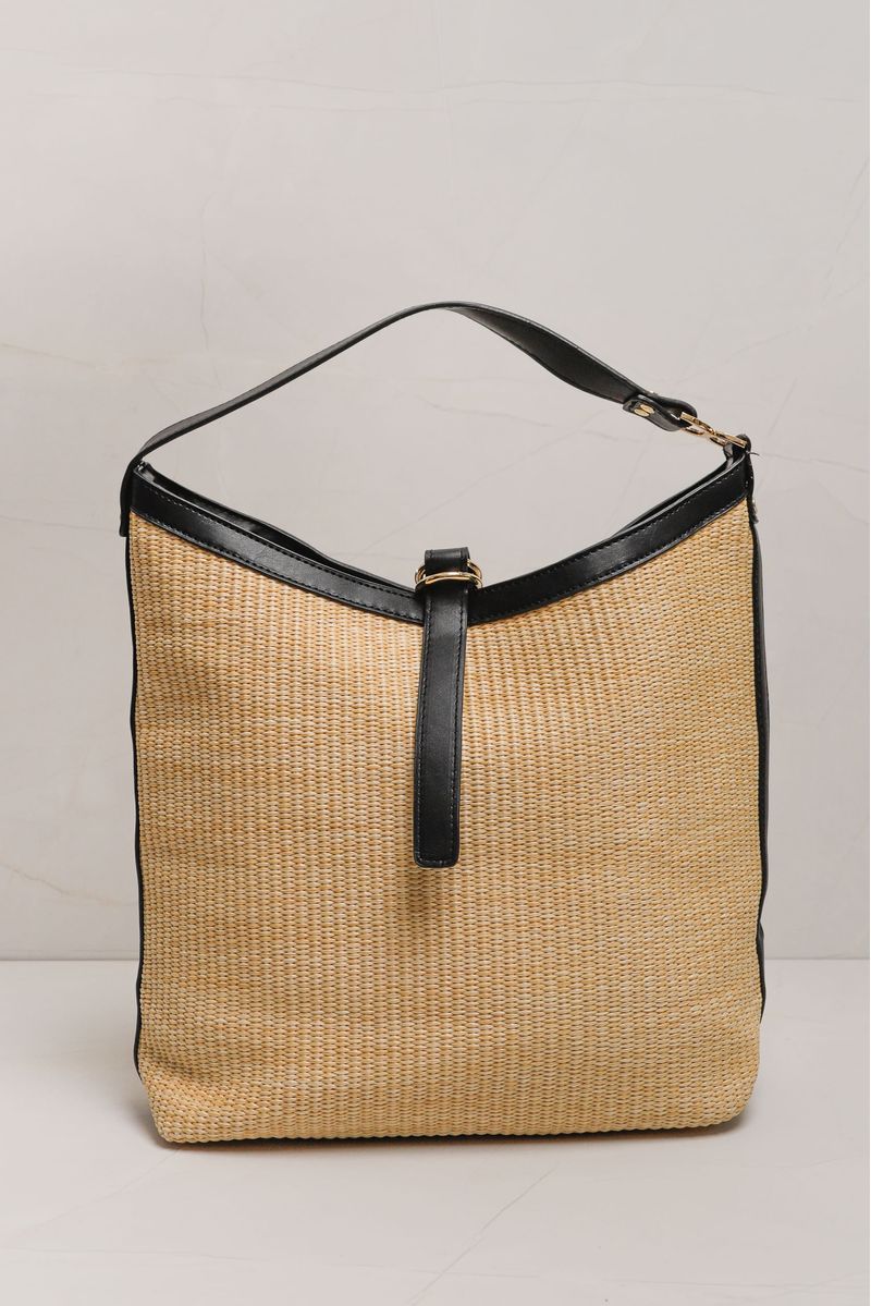 Bolsa grande em palha com alça curta, ideal para usar na mão ou no ombro. Conta com forro interno, bolsos funcionais e fechamento seguro por zíper, além de uma tira com argolas que adiciona um charme extra.