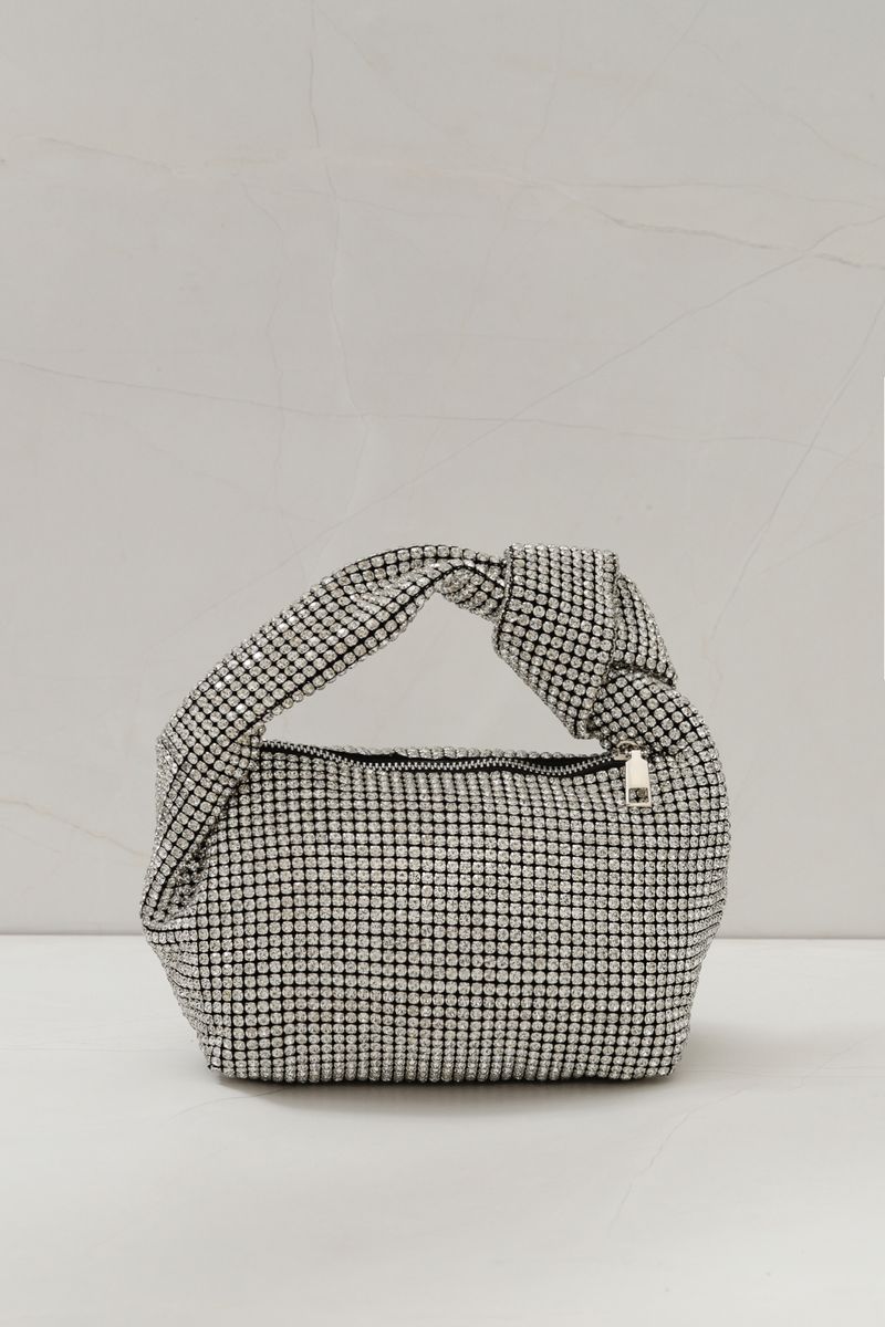Bolsa em malha cravejada, com alça de mão que possui detalhe em nó, trazendo um toque diferenciado ao acessório. Forro interno, bolsinho prático e fechamento superior por zíper, garantindo praticidade e charme.