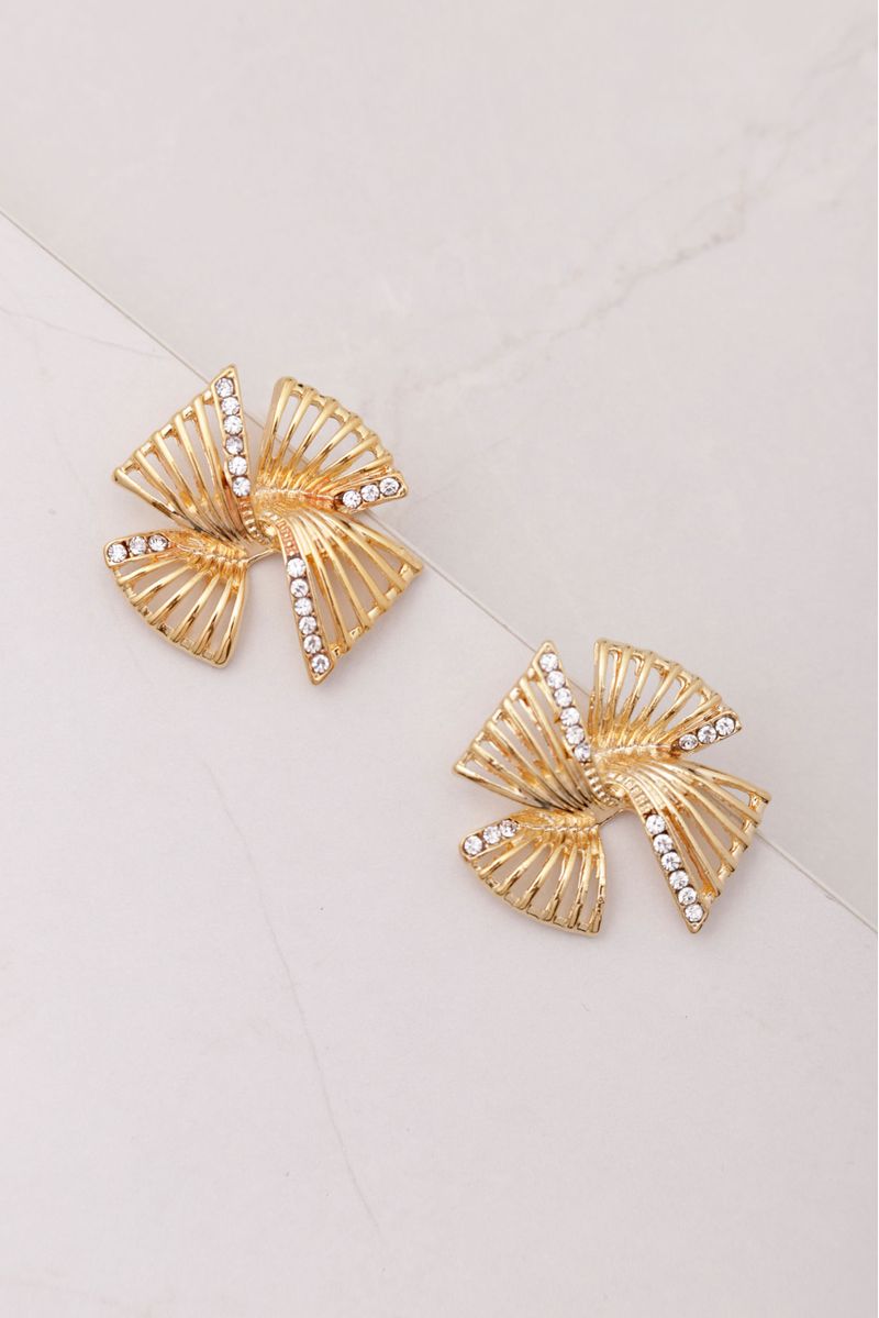Brinco dourado metal aramado, com aplicação de strass, fecho por tarraxa. Acompanha caixinha quadrada com moldura polipropileno com push e fita stretch.
