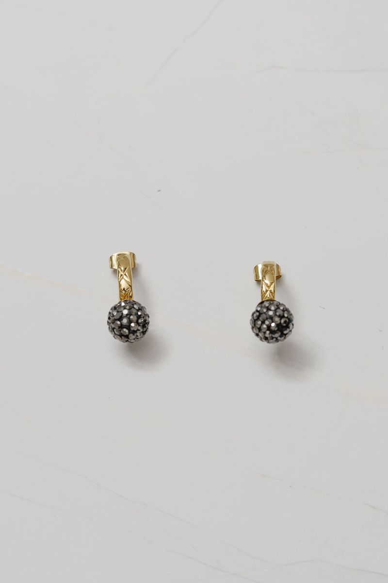 Brinco meia argola 2,5cm em aço inoxidável banhado, com detalhe vazado e aplicação de esfera cravejada em zircônias. Uma peça sofisticada e cheia de brilho para iluminar qualquer look. Fecho por tarraxa.