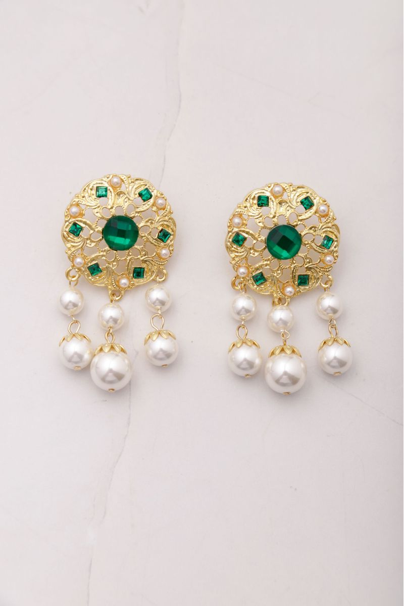 Brinco trançado dourado com cristais e pérolas, fecho por tarraxa. Acompanha caixinha quadrada com moldura polipropileno com push e fita stretch.