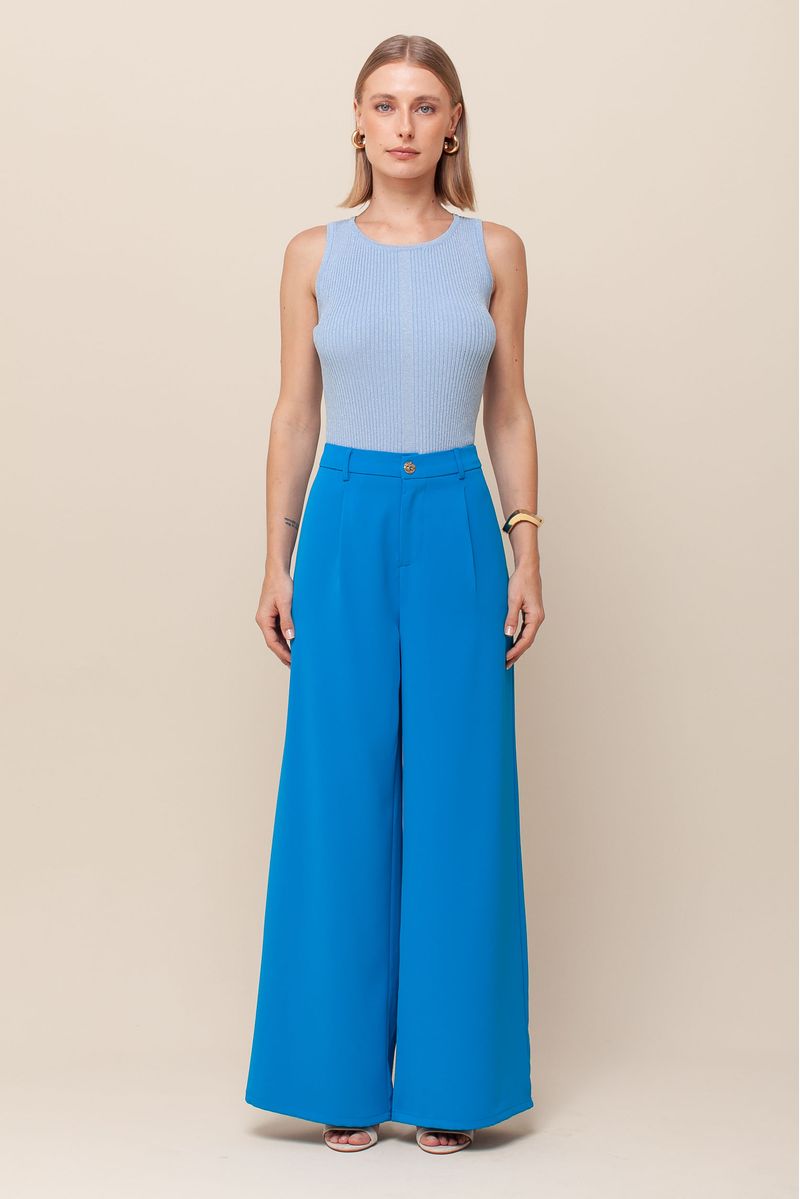 Calça pantalona em crepe sem forro, com pregas frontais e cintura alta que alonga a silhueta. Possui bolsos faca, fechamento por zíper e botão, além de cós com passador para cinto, unindo sofisticação e estilo clássico.