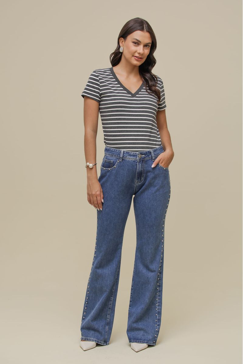 Calça jeans flare de cintura alta, confeccionada em denim estruturado sem elastano. Possui bolsos frontais e posteriores, além de aplicação de rebites nas laterais por toda a extensão, trazendo um toque de personalidade à peça. Modelagem de tamanho regular.