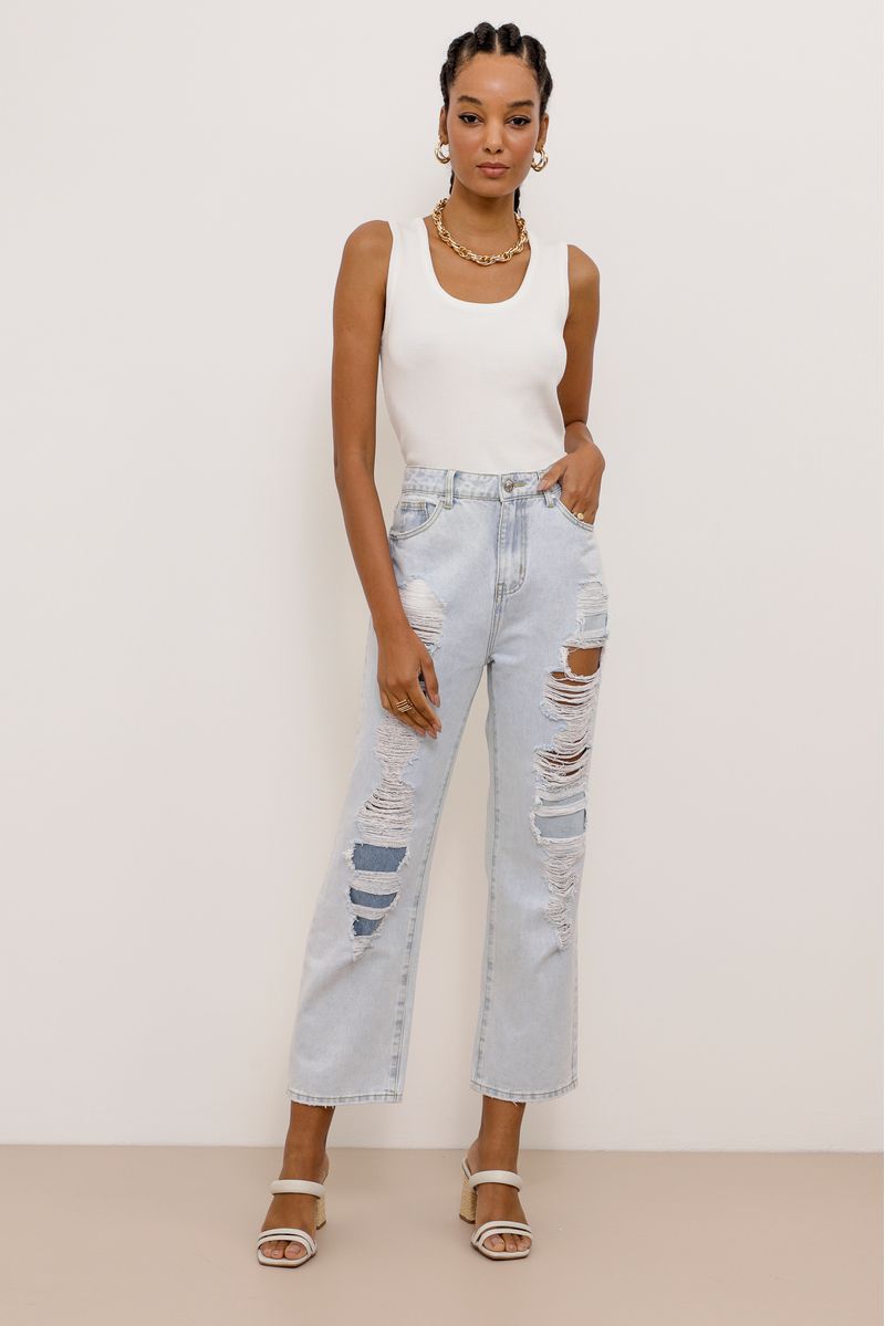 Calça jeans reta, destroyed na parte frontal. Fechamento por zíper e botão, possui bolsos frontais e posteriores.