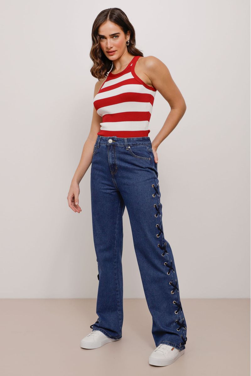 Calça reta, confeccionada em jeans. Possui detalhes nas laterais de ilhós com cordão, bolsos frontais e posteriores com fechamento zíper e botão.